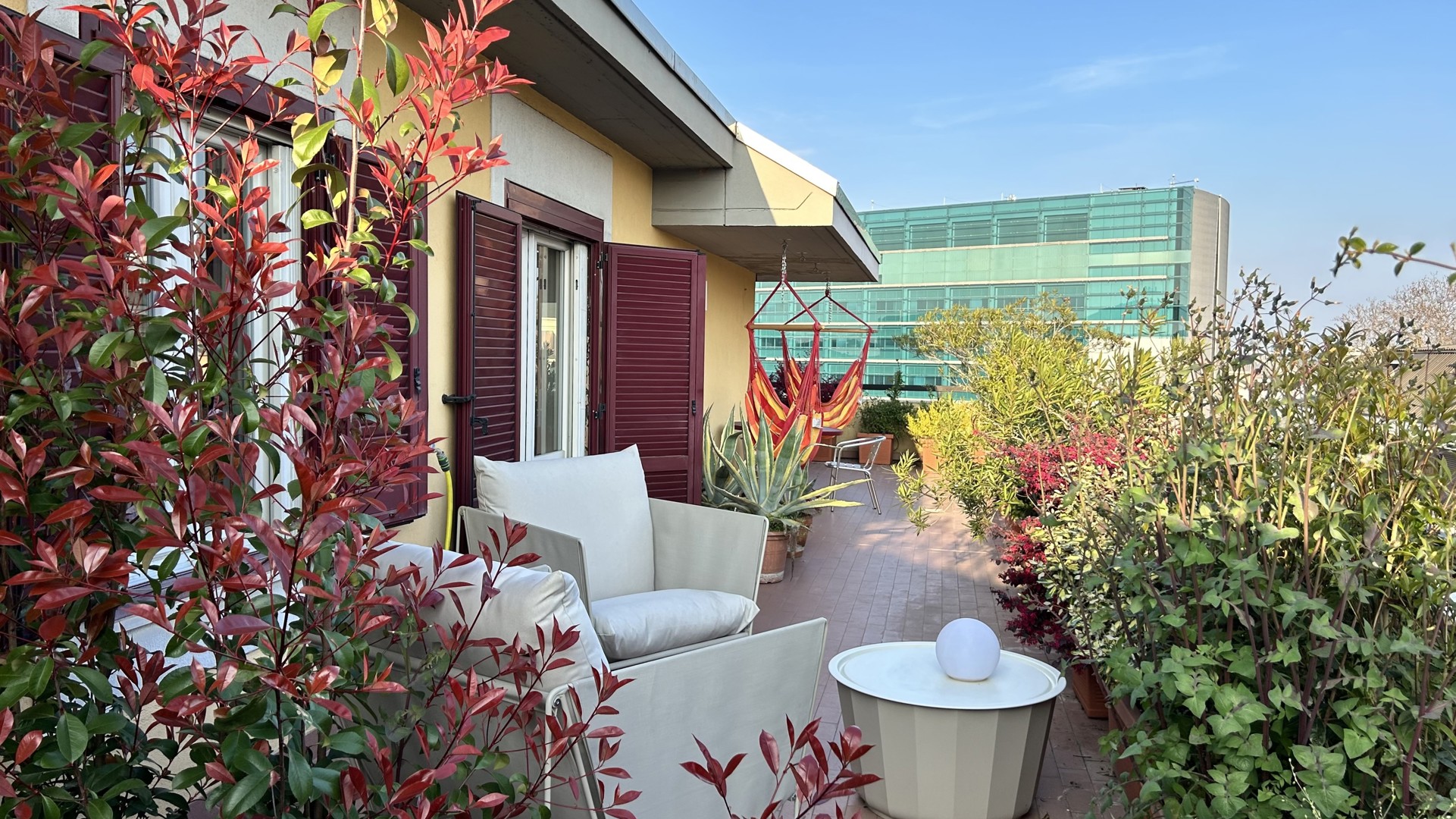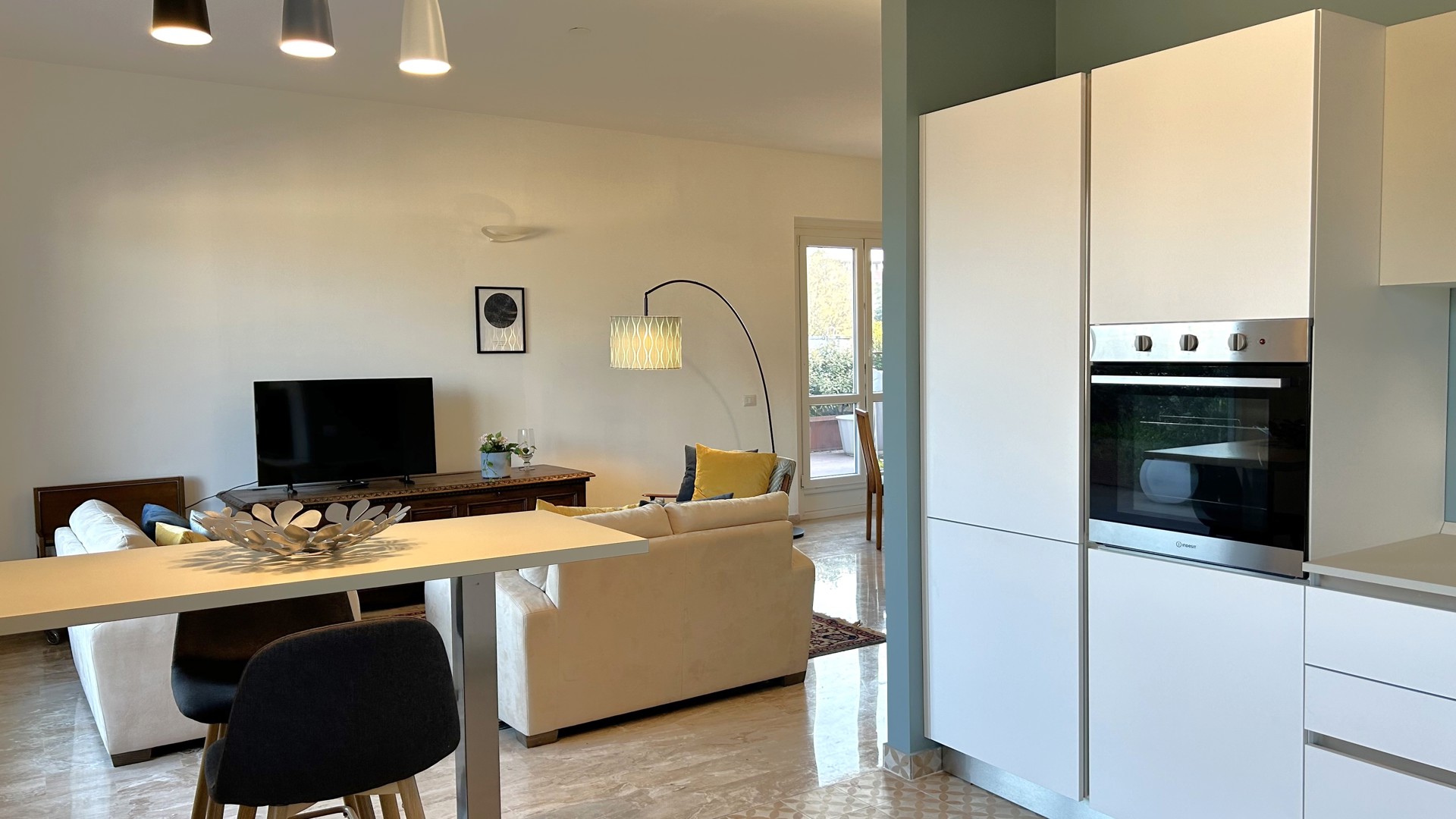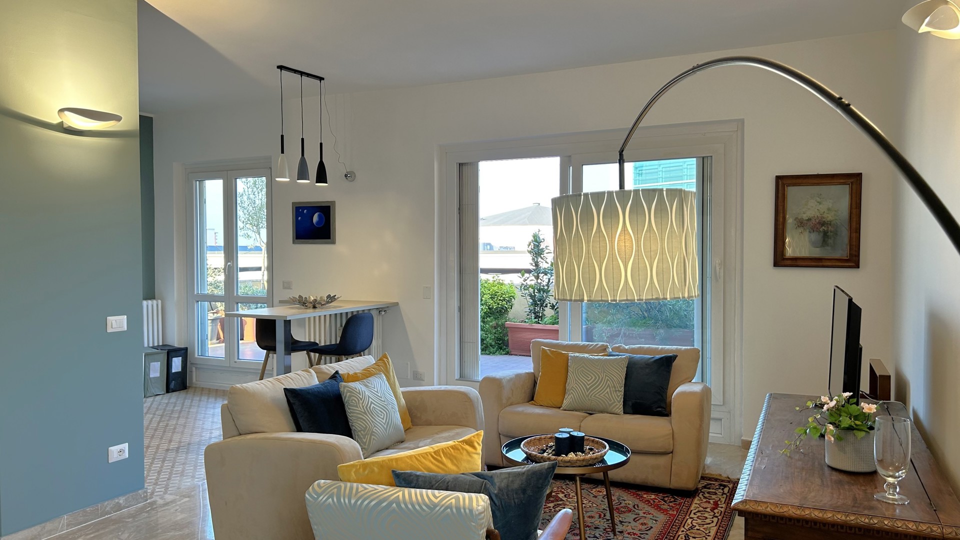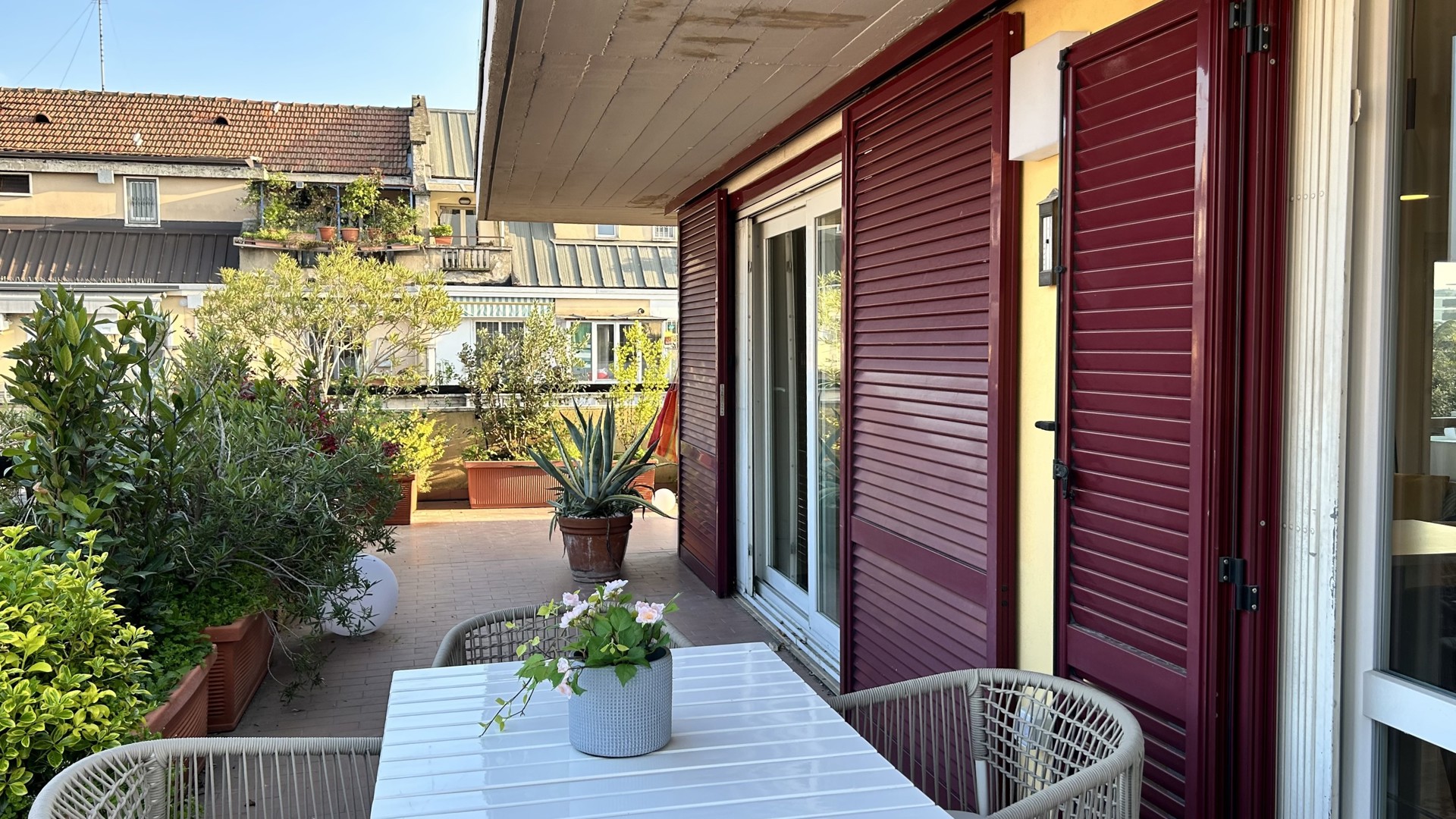 Raffinato trilocale con ampio terrazzo posto al quarto piano di un'elegante palazzo nel quartiere Lambrate di Milano. L'appartamento è composto da un ingresso su ampia zona giorno con salotto e una cucina a vista completamente attrezzata e sala da pranzo, zona lavanderia e bagno con doccia. La zona notte e composta da due camere da letto, una con due letti singoli, una scrivania e armadio a muro, l'altra camera da letto ha un letto matrimoniale con armadio a muro ed accesso sul terrazzo; completa la zona notte un moderno bagno con doccia. L'appartamento è stato completamente ristrutturato e ha un magnifico terrazzo che circonda tutto l'appartamento ed è dotato di arredi da esterno.