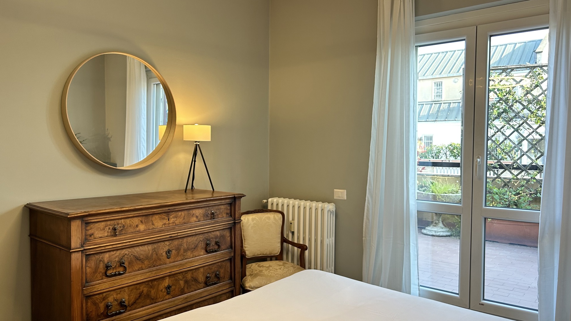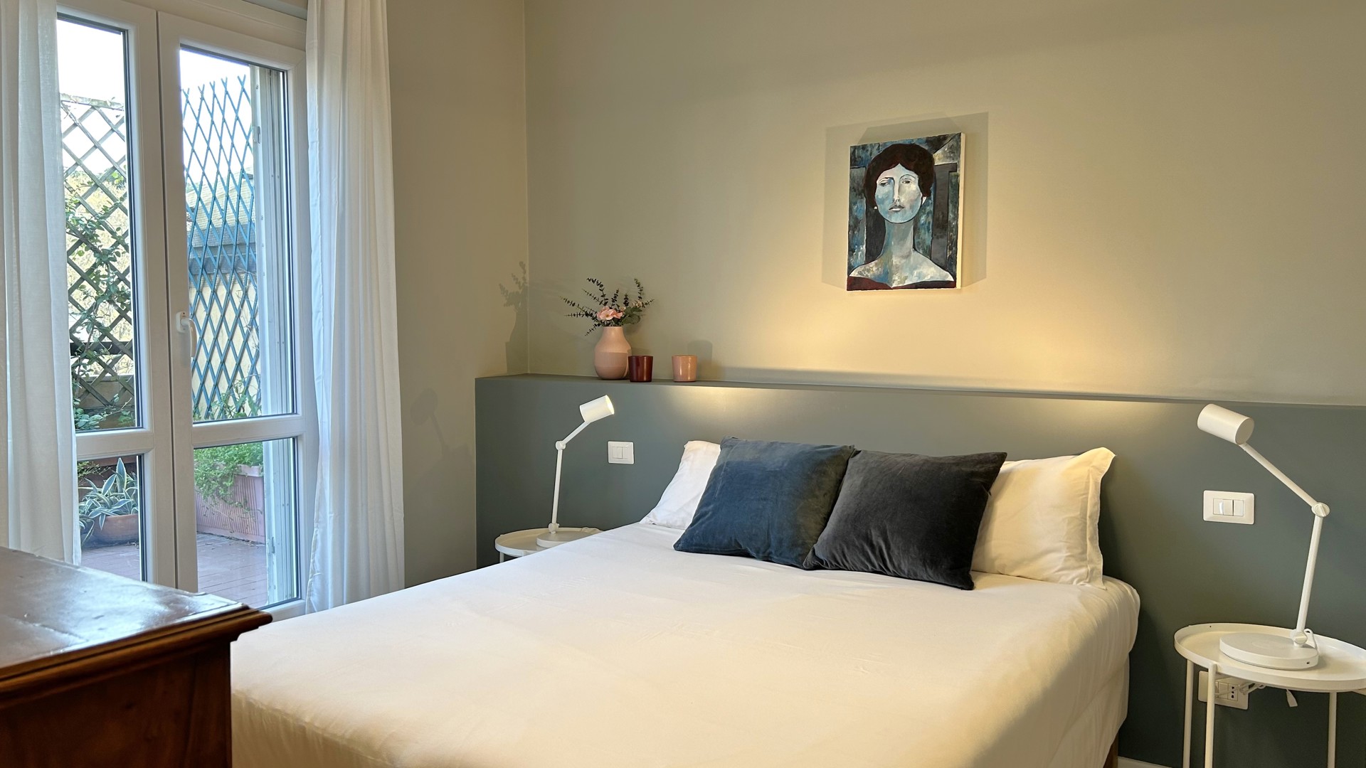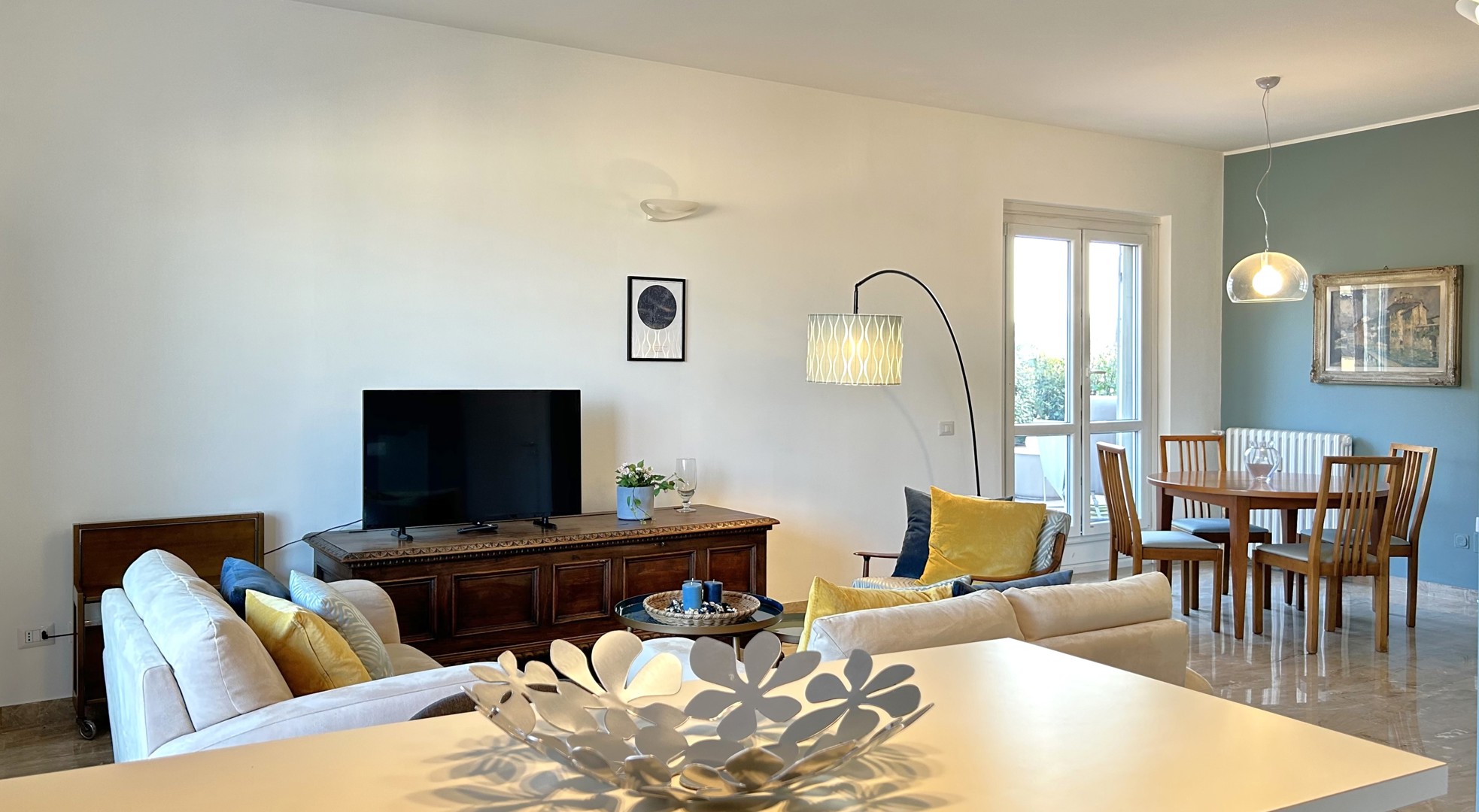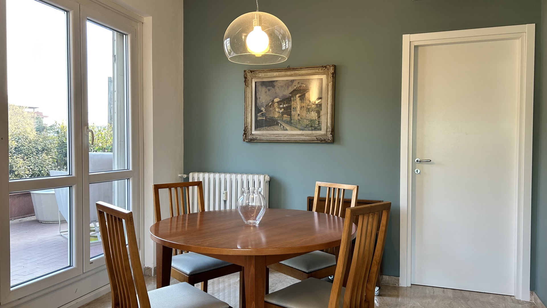 Raffinato trilocale con ampio terrazzo posto al quarto piano di un'elegante palazzo nel quartiere Lambrate di Milano. L'appartamento è composto da un ingresso su ampia zona giorno con salotto e una cucina a vista completamente attrezzata e sala da pranzo, zona lavanderia e bagno con doccia. La zona notte e composta da due camere da letto, una con due letti singoli, una scrivania e armadio a muro, l'altra camera da letto ha un letto matrimoniale con armadio a muro ed accesso sul terrazzo; completa la zona notte un moderno bagno con doccia. L'appartamento è stato completamente ristrutturato e ha un magnifico terrazzo che circonda tutto l'appartamento ed è dotato di arredi da esterno.