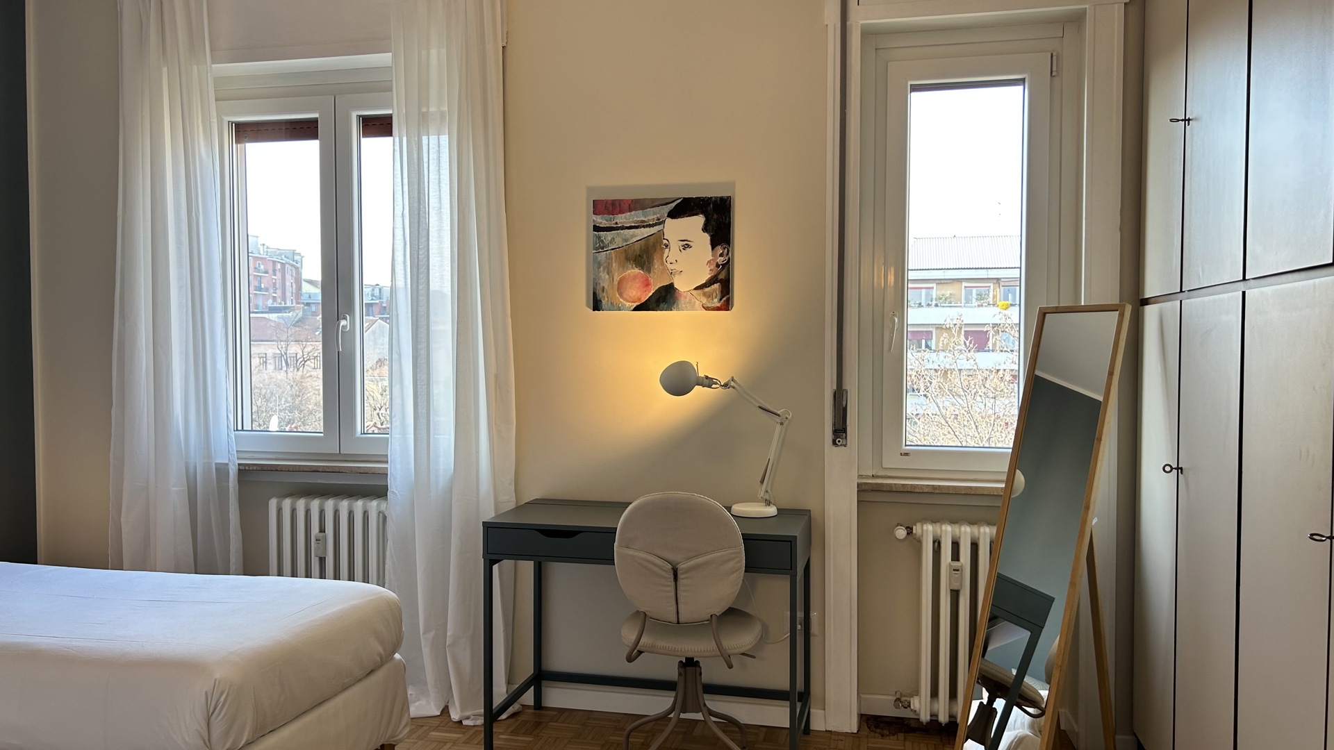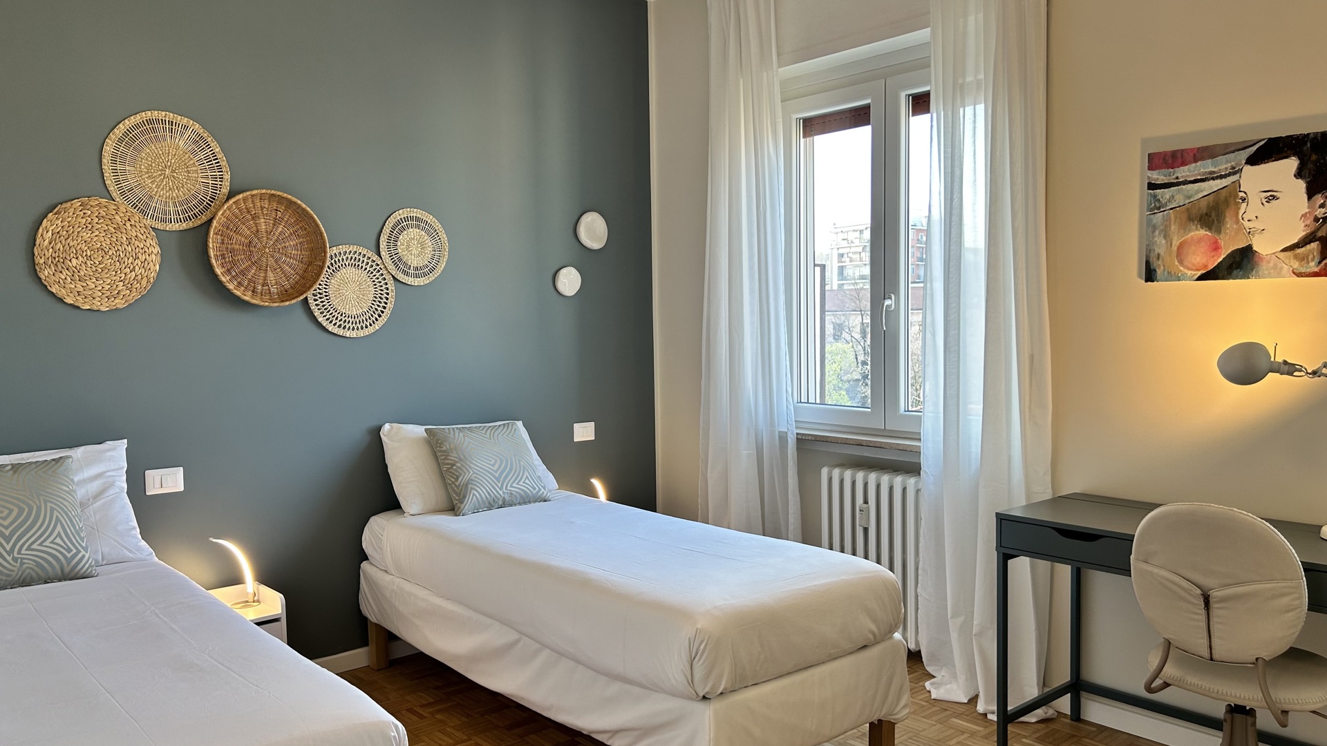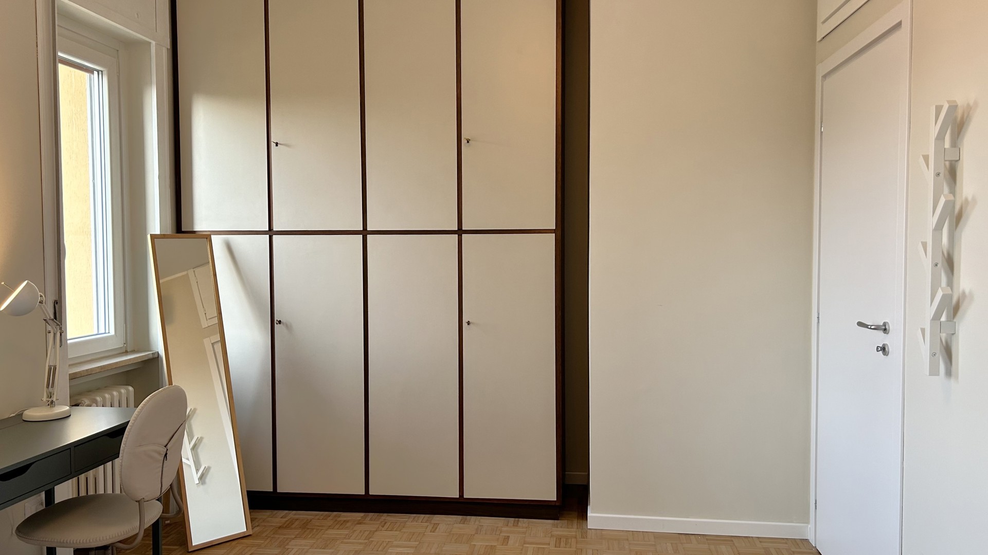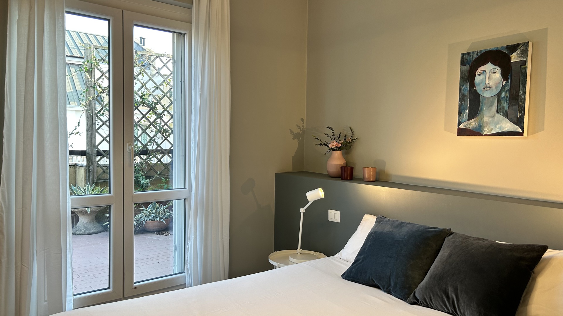 Raffinato trilocale con ampio terrazzo posto al quarto piano di un'elegante palazzo nel quartiere Lambrate di Milano. L'appartamento è composto da un ingresso su ampia zona giorno con salotto e una cucina a vista completamente attrezzata e sala da pranzo, zona lavanderia e bagno con doccia. La zona notte e composta da due camere da letto, una con due letti singoli, una scrivania e armadio a muro, l'altra camera da letto ha un letto matrimoniale con armadio a muro ed accesso sul terrazzo; completa la zona notte un moderno bagno con doccia. L'appartamento è stato completamente ristrutturato e ha un magnifico terrazzo che circonda tutto l'appartamento ed è dotato di arredi da esterno.